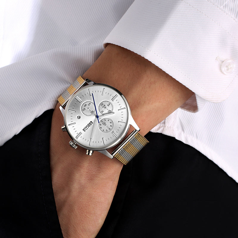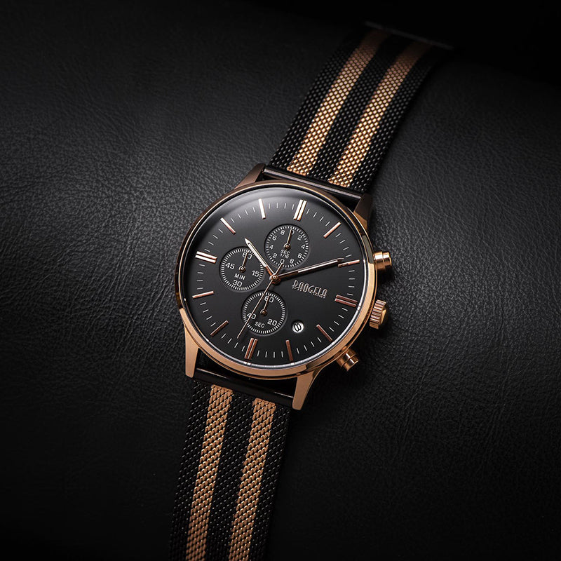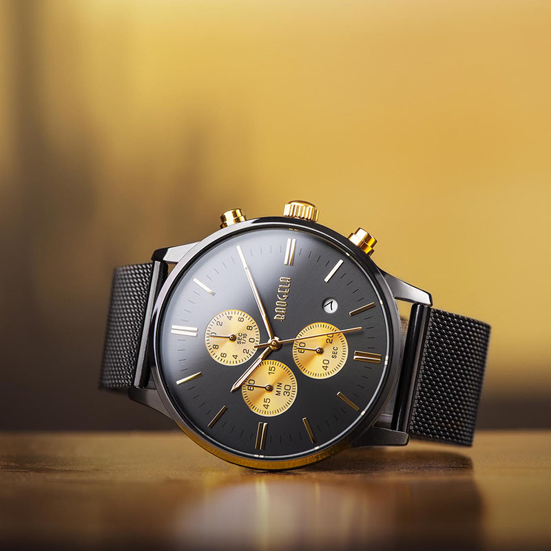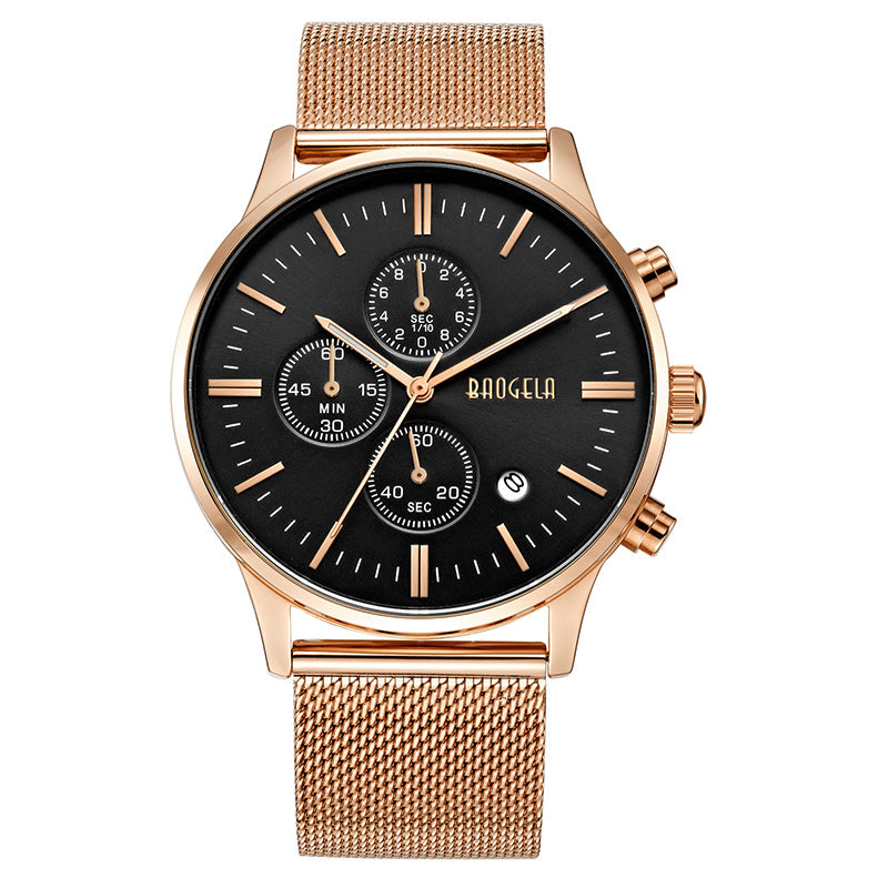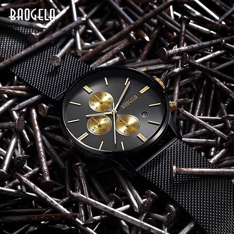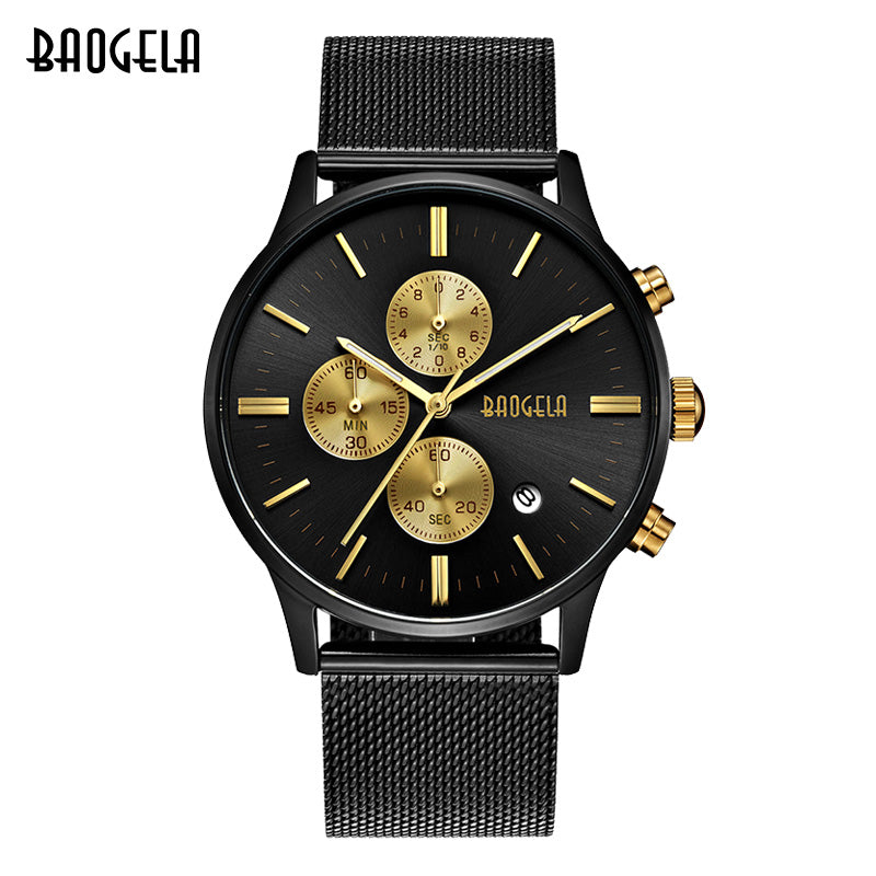BAOGELA Men's Watch Waterproof, Analog Quartz Wrist Watches Gold With Black Stainless Steel Mesh Band, Chronograph Date 1611