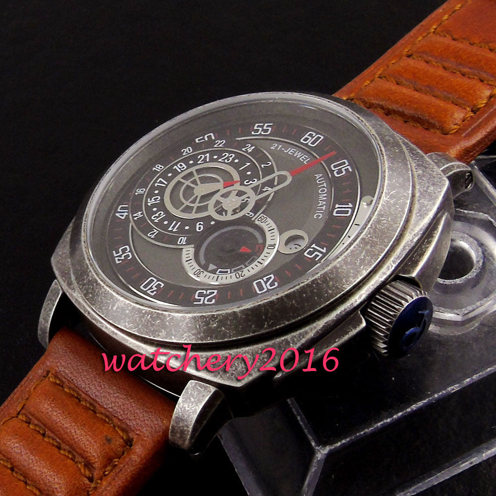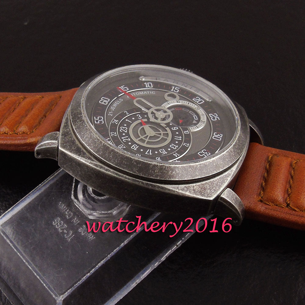 Brushed 44mm Parnis black dial stainless steel case sapphire glass leather strap miyota automatic movement Mens Wristwatches