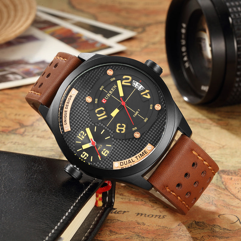 CURREN luxury brand 2017 New black leather Strap Fashion Casual Business 30 meter Waterproof Relogio Mascu Dual time zone 8252