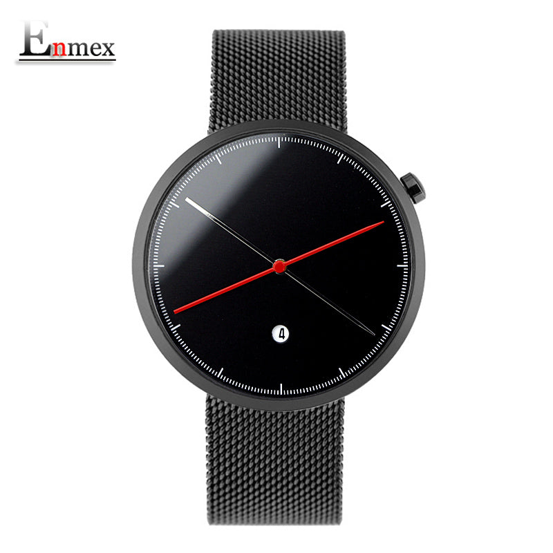Enmex creative style cool wristwatch two balance hands with calendar stainless steel strap fashion Stylish clock quartz watch