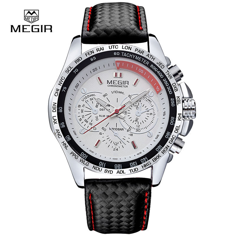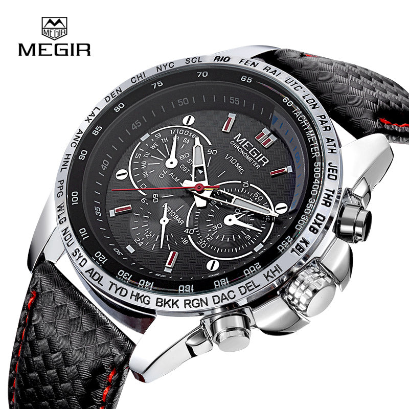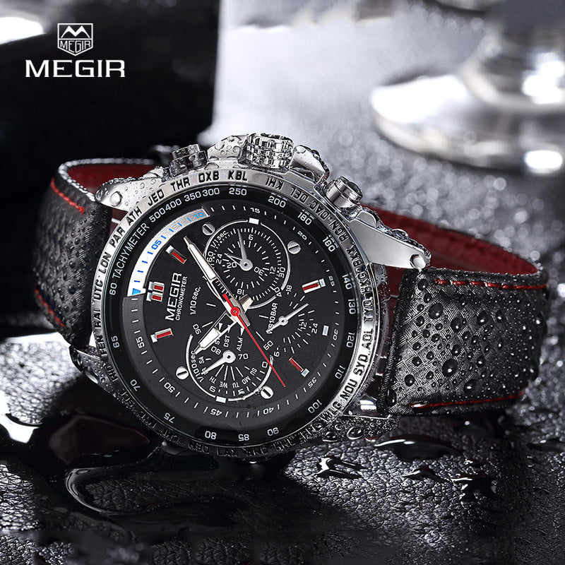 MEGIR hot fashion man's quartz wristwatch brand waterproof leather watches for men casual black watch for male 1010