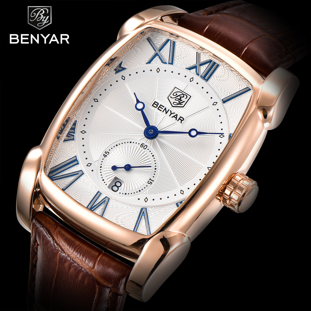 Men Watches BENYAR Brand Luxury Waterproof Genuine Leather Quartz Watch Classic Rectangle Case Auto Date Fashion Casual Watches
